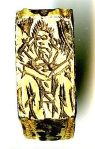 Found near Wing, and dating to 1300-1500 AD, it shows the origin of the Christian Easter story – Jesus Christ crucified. It also has a larger figure above him – presumably meant to represent God. Christianity was a central part of life in medieval England, and wearing religious jewellery demonstrated both your devotion to God, as well as your personal wealth. Whilst jewellery was common for both men and women, the fact that this ring is in gold, rather than gilded (gold plated) silver, or even bronze, shows the wealth of the original owner.
