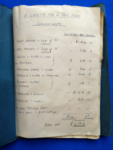 In the carefully laid out folder Miss Vinten gives clear instructions for new parents regarding the clothes a baby will need, materials required to make the garments, overall cost of materials and how many clothing coupons would be needed (remember, wartime rationing was still in place in 1947.)