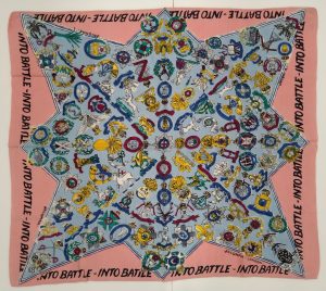 The scarf was given to Rita Bowring in the early 1940s as a gift from her fiancé in the British Army. Its design features army regimental crests alongside the logo ‘INTO BATTLE’. These propaganda scarves were popularly given between young lovers and helped boost morale on the home front.