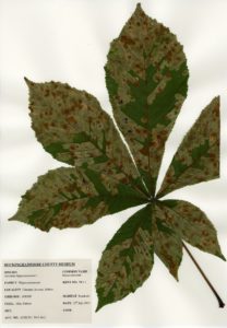 The tree is the Horse Chestnut, or ‘conker tree’ – a familiar sight on village greens, parks and roadsides. However, we only encounter this tree today because of the 2,000 mile journey its conkers made all the way from Greece 400 years ago in the hands of plant collectors. In recent years, Horse Chestnut leaves have started to show unusual markings in summer (see photo). These are caused by caterpillars of the Horse-Chestnut Leaf Miner moth that eat the leaves from the inside. But where did this moth suddenly appear from? Back in Greece the tree and the moth have always lived together. It is just that it has taken the moth 400 years to catch up with the tree in Britain! This has been possible due to improved transport routes to remote mountainous areas of Greece and the increasing number of chestnuts planted across Europe, allowing the moth to slowly make its way to Britain. Despite appearances the caterpillar does not harm the tree.